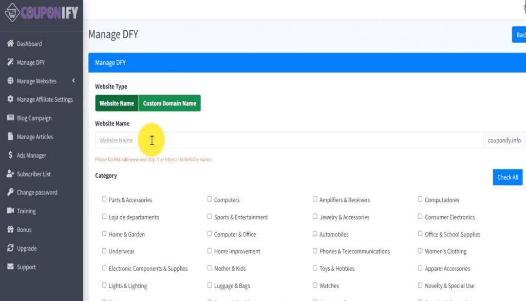 Choose any coupon niche you want to place on your website. Couponify app automatically creates a complete coupon affiliate website for you in just seconds and automatically embeds each coupon with your affiliate link.